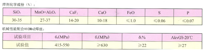 配合焊絲(如H08MnA,H08Mn2,H08Mn2Mo)可焊接低合金鋼(如16Mn,15MnV,15MnVN等)結(jié)構(gòu),廣泛用于船舶、鍋爐、高壓容器等。細(xì)粒度焊劑,可用于細(xì)絲埋弧焊,焊接薄板結(jié)構(gòu)。